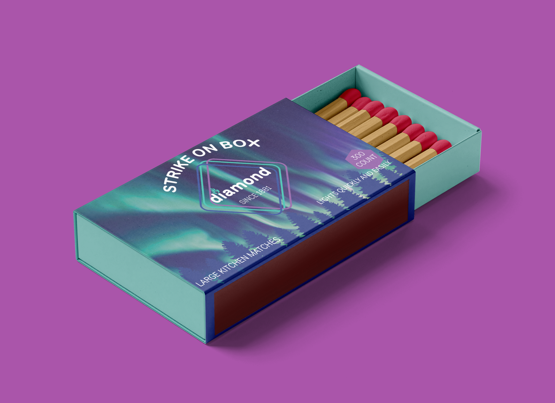 As someone who loves to spend time outdoors, I was excited to provide custom branding and packaging designs for a fictional camping-themed line of Diamond matches. For this special line, I wanted to create a design that could serve as functional art for a living room, a book nook, a man cave, or a hunting shack. To achieve this, I incorporated the Aurora Borealis lighting up the night sky over a line of trees, resulting in an awe-inspiring nature theme that burns as bright as the matches it contains.